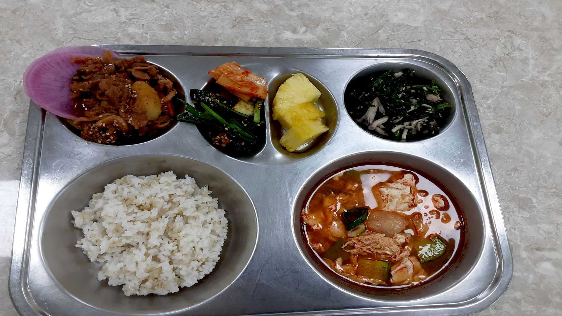 4월15일 식단: 발아현미밥,순두부계란국,오리불고기&무쌈,부추오이무침-자율,쑥갓애느타리무침,파인애플조각,배추김치