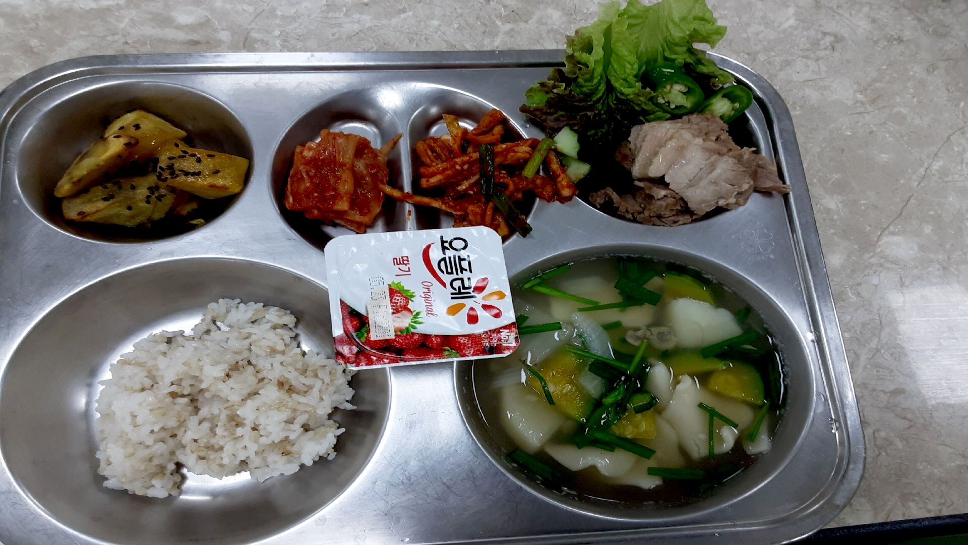 5월9일 식단 입니다: 보리밥,재첨수제비국,돼지고기수육,무말랭이무침,고구마맛탕,호상요쿠르트,상추%오이스틱%쌈장,배추김치