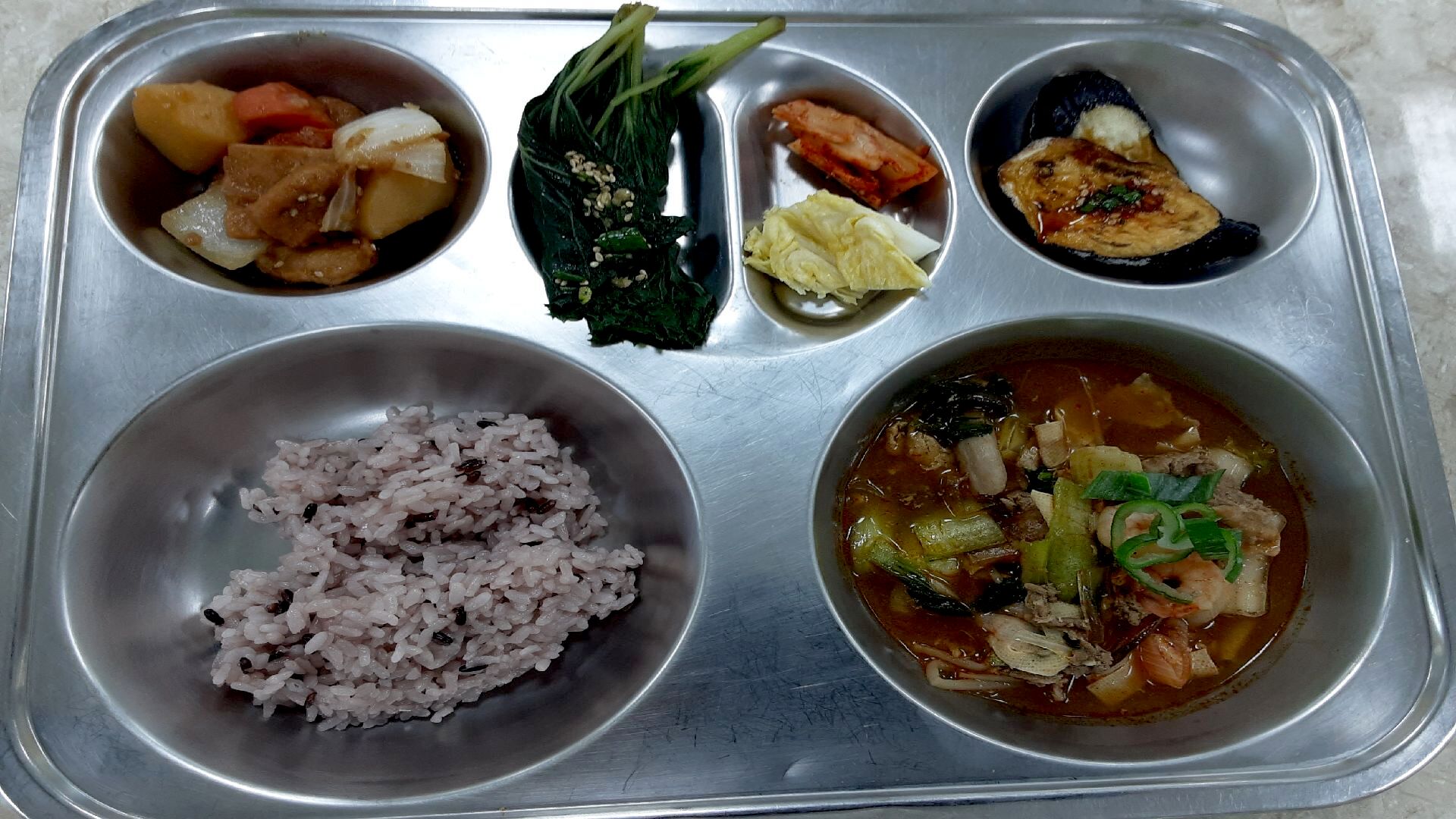 6월5일: 흑미밥,순한마라탕,감자조림,가지오븐구이,머위쌈(자율)백김치,배추김치