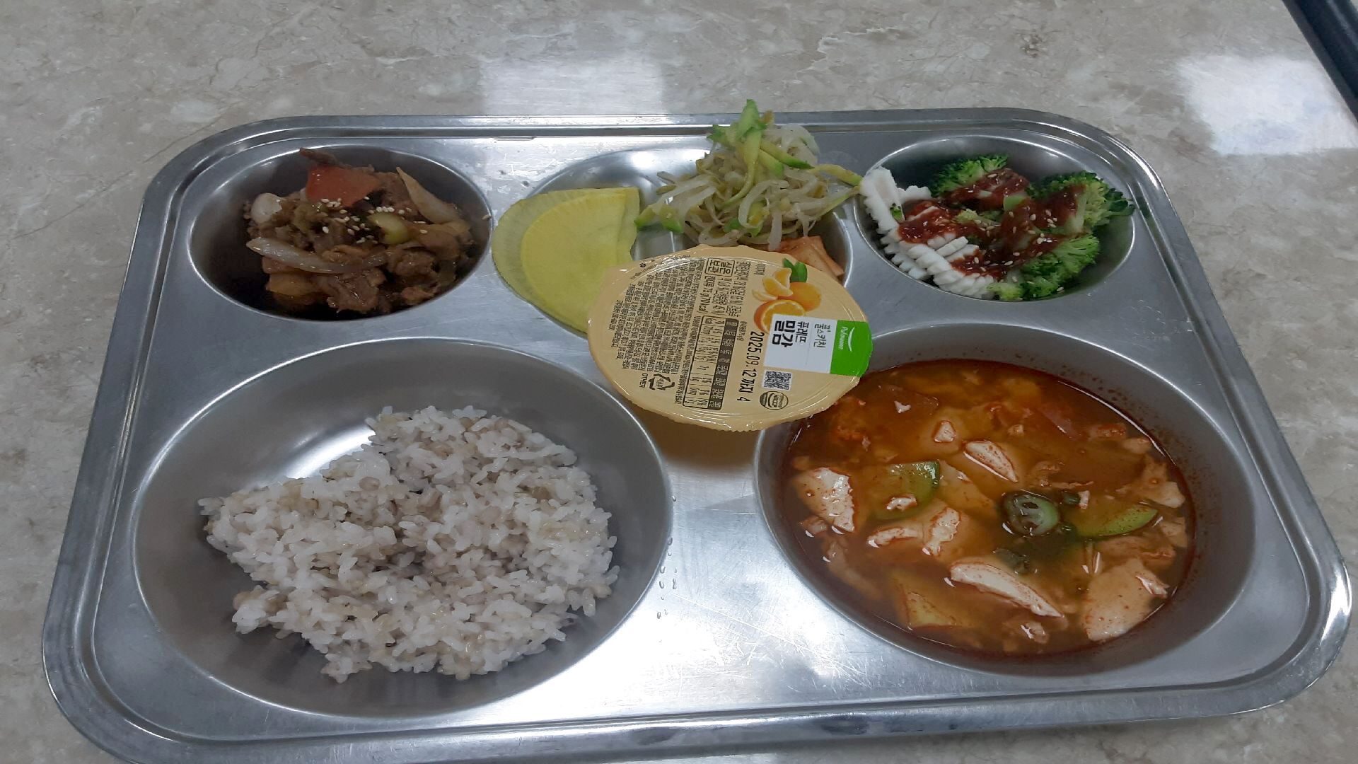 6월16일 : 혼합잡곡밥,순두부게란국,오징어브로콜리&초고추장,오리불고기&무쌈,숙주호박나물,푸딩,배추김치
