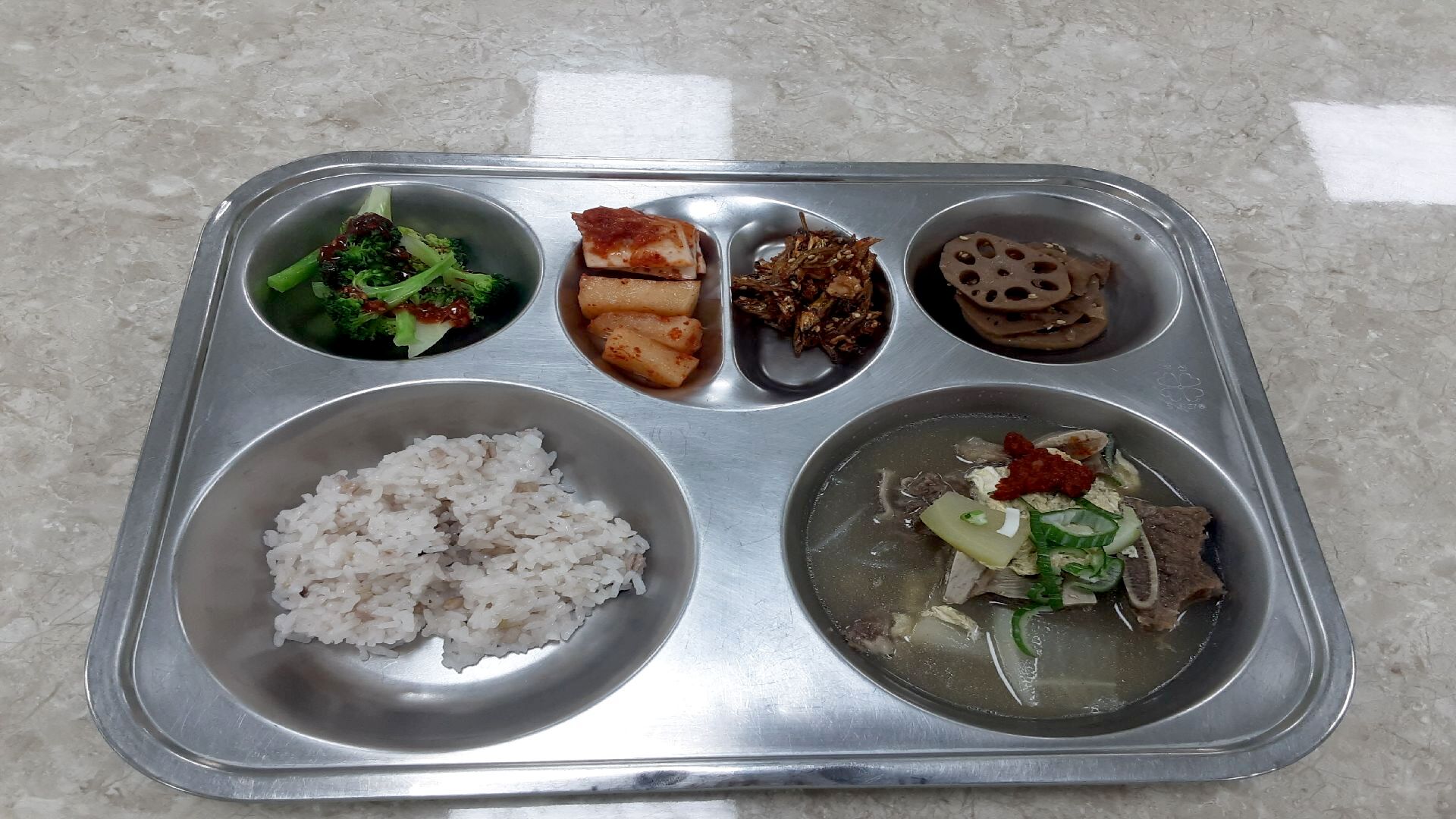 6월24일: 혼합잡곡밥,갈비탕,연근조림,브로콜리&초고추장,멸치볶음,석박지,배추김치