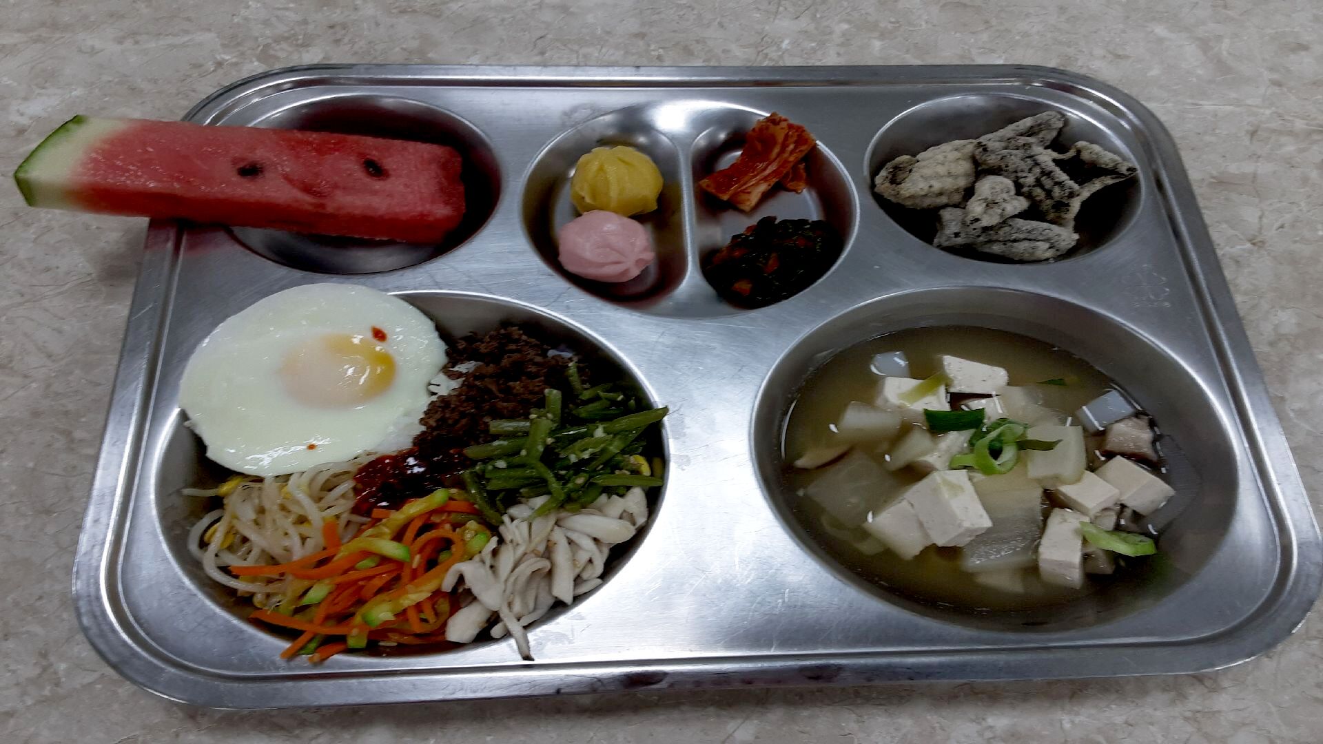 7월16일: 비빔밥,두부장국,김부각,꿀떡,수박,배추김치