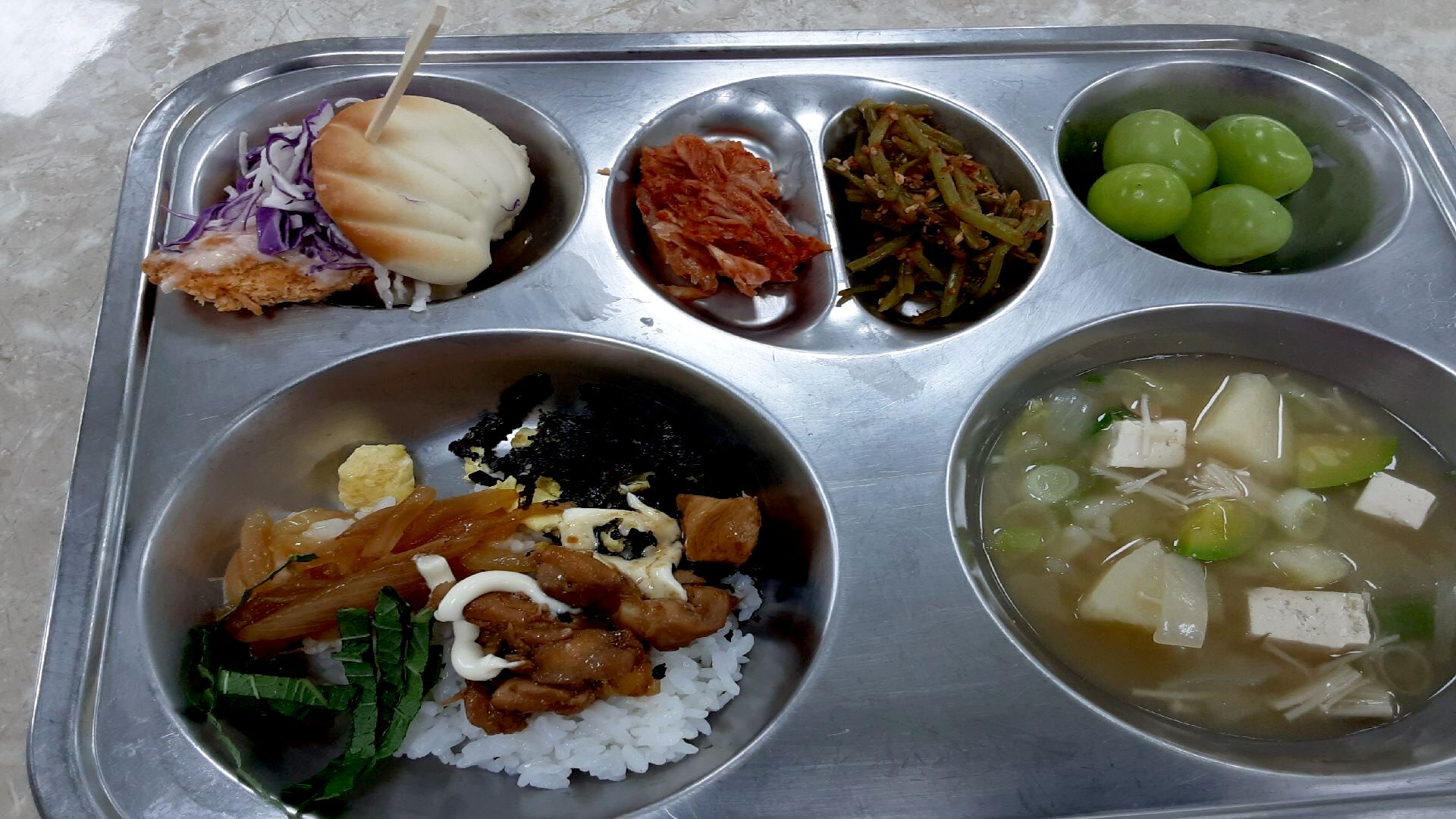 치킨마요덮밥,팽이버섯된장국,샤인머스켓,쉬림프버거,배추김치,고구마줄기볶음