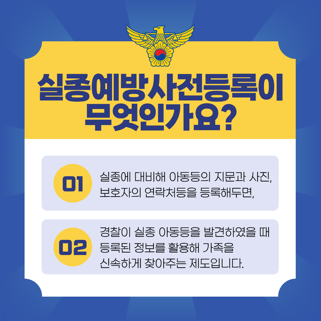 최근 초등학교 주변에서 하교하는 학생들에게 접근하여 납치, 유괴 등 범죄를 시도하는 사건이 자주 발생함에 따라, 아이들의 안전에 대한 우려가 커지고 있습니다. 이와 관련하여 학생의 실종에 대비하여 지문, 사진, 보호자의 연락처를 미리 등록하여 경찰이 실종 학생을 발견하였을 때, 등록된 정보를 활용해 가족을 신속하게 찾아줄 수 있는 「실종 예방 사전 등록 가이드」를 안내드립니다.